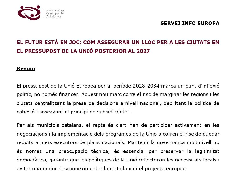 La Federació de Municipis de Catalunya, a través del Servei Info Europa, ha publicat el sisè Policy Brief a l’Observatori de les Polítiques Europees amb Impacte Local, titulat “El futur està en joc: com assegurar un lloc per a les ciutats en el pressupost de la Unió posterior al 2027”.